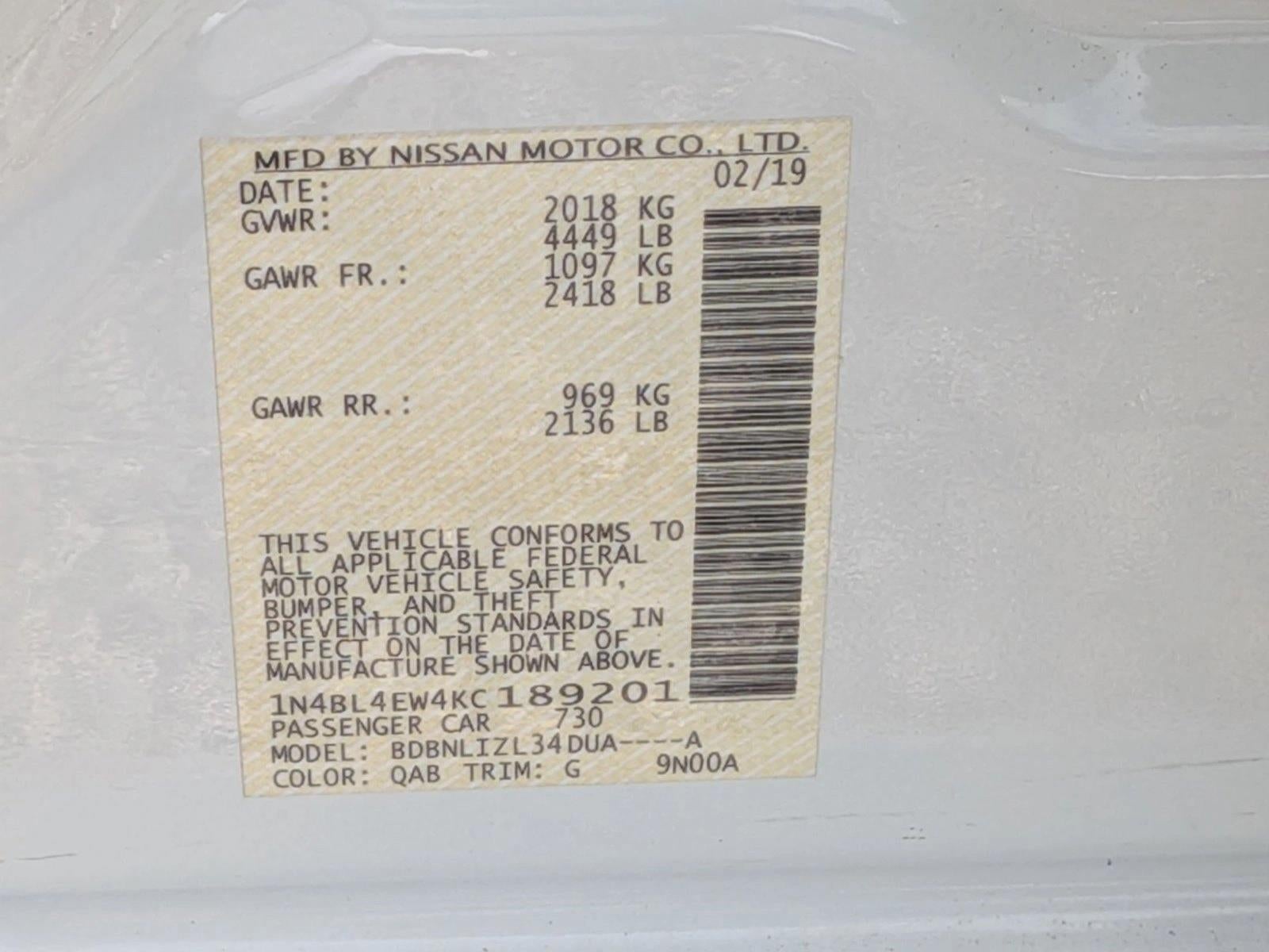 Audi Hunt Valley is pleased to be currently offering this 2019 Nissan Altima 2.5 SL with 98,636mi. This Nissan includes: CHARCOAL, LEATHER-APPOINTED SEAT TRIM Leather Seats PEARL WHITE TRICOAT *Note - For third party subscriptions or services, please contact the dealer for more information.* This 2019 Nissan Altima has great acceleration and wonderful styling without sacrificing exceptional fuel economy. You'll love the feel of AWD in this 2019 Nissan Altima. It provides a perfect balance of handling power and control in virtually every driving condition. Marked by excellent quality and features with unmistakable refined leather interior that added value and class to the Nissan Altima 2.5 SL. This gently driven vehicle has been well-kept and still has the showroom shine. You demand the best in everything, so why would your automobile be any different? Enjoy the best features available in this stunning Nissan Altima. Unique and nearly impossible to find, this 2019 Nissan Altima 2.5 SL is a collector's dream come true.