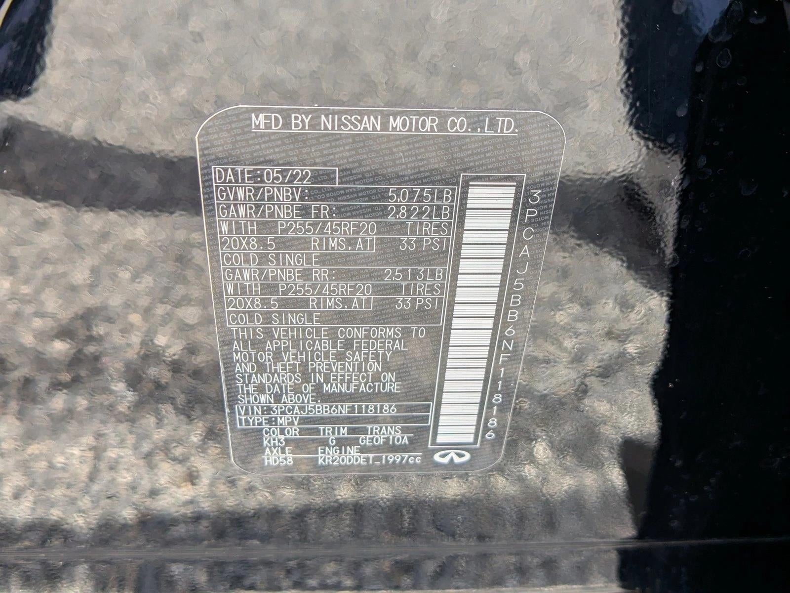 Thank you for your interest in one of AutoNation Toyota White Marsh's online offerings. Please continue for more information regarding this 2022 INFINITI QX50 LUXE with 40,579mi. The INFINITI QX50 is the benchmark all other SUVs strive to meet. With exceptional power, towing and handling, this SUV can handle anything thrown at it. Indulge yourself with one of the most highly crafted, most luxurious automobiles available today. Enjoy the grip and control of AWD performance in this nicely equipped INFINITI QX50 LUXE. This 2022 INFINITI QX50 has such low mileage it has been parked more than driven. Intricately stitched leather and ergonomic design seats are among the details in which test drivers say that INFINITI QX50 LUXE is in a league of its own AutoNation Toyota White Marsh is pleased to be currently offering this 2022 INFINITI QX50 LUXE with 40,545mi. In their original incarnation, SUVs were chiefly owned by folks who valued utility above sport. Not anymore! The INFINITI QX50 LUXE redefines the SUV and makes the perfect all around family companion. Excellence, luxury and stature are just a few of the pillars this car is built upon. Enjoy driving? Well now you will get more thrills behind the wheel thanks to the heightened performance of AWD. Better handling. Better traction. Better driving experience. Low, low mileage coupled with an exacting maintenance program make this vehicle a rare find.