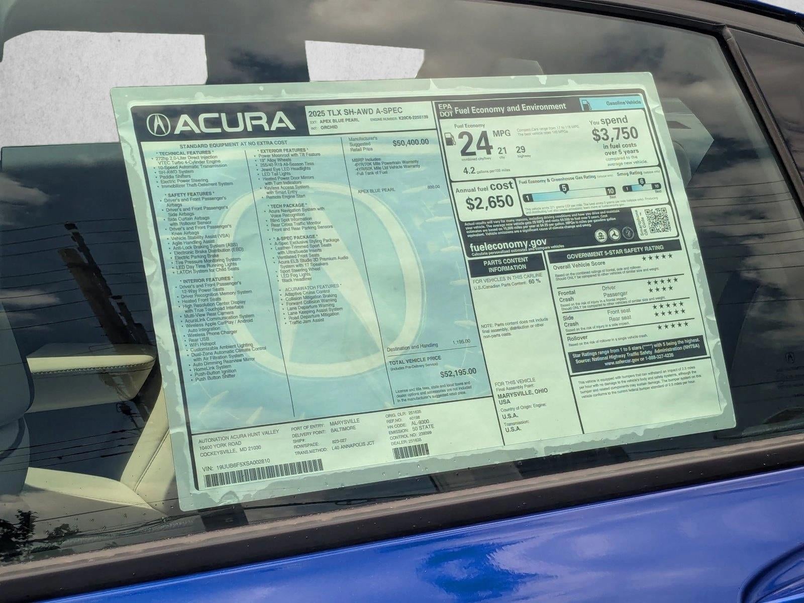 AutoNation Acura Hunt Valley has a wide selection of exceptional pre-owned vehicles to choose from, including this 2025 Acura TLX. This Acura includes: APEX BLUE PEARL ORCHID, PREMIUM PERF MILANO LEATHER Leather Seats Premium Synthetic Seats *Note - For third party subscriptions or services, please contact the dealer for more information.* The Acura TLX w/A-Spec Package's pristine good looks were combined with the Acura high standard of excellence in order to make this a unique find. This AWD-equipped vehicle will handle beautifully on any terrain and in any weather condition your may find yourself in. The benefits of driving an all wheel drive vehicle, such as this Acura TLX w/A-Spec Package, include superior acceleration, improved steering, and increased traction and stability. Marked by excellent quality and features with unmistakable refined leather interior that added value and class to the Acura TLX w/A-Spec Package.