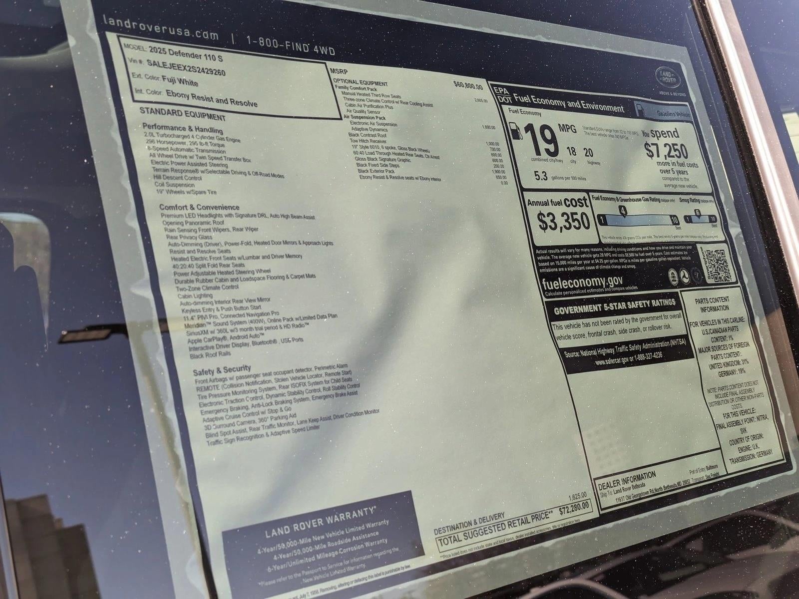 Thank you for your interest in one of Land Rover Hunt Valley's online offerings. Please continue for more information regarding this 2025 Land Rover Defender S with 7,380mi. This Land Rover includes: FAMILY COMFORT PACKMulti-Zone A/C 3rd Row Seat A/C Climate Control Rear A/C Pass-Through Rear Seat BLACK CONTRAST ROOFBLACK EXTERIOR PACKAIR SUSPENSION PACKAir Suspension Active Suspension BLACK CONTRAST SIGNATURE GRAPHIC W/INTERIOR STORAGEBLACK FIXED SIDE STEPS (PIO)Running Boards/Side Steps TOW HITCH RECEIVERTow Hitch EBONY, RESISTCloth Seats Premium Synthetic Seats HEATED REAR SEATS W/CENTER ARMRESTHeated Rear Seat(s) Pass-Through Rear Seat WHEELS: 19" GLOSS BLACK STYLE 6010Chrome Wheels Aluminum Wheels Steel Wheels FUJI WHITE*Note - For third party subscriptions or services, please contact the dealer for more information.*The Land Rover Defender S offers a fair amount of utility thanks to its advanced features and unique styling. It's also quite sporty, and injects an ample amount of handling chutzpah into the ridin'-high body of a family-friendly SUV. There's a level of quality and refinement in this Land Rover Defender S that you won't find in your average vehicle. Hit the gas pedal and put the engine power to all four wheels. With AWD, you'll have the greater performance right off the line, every time you drive.